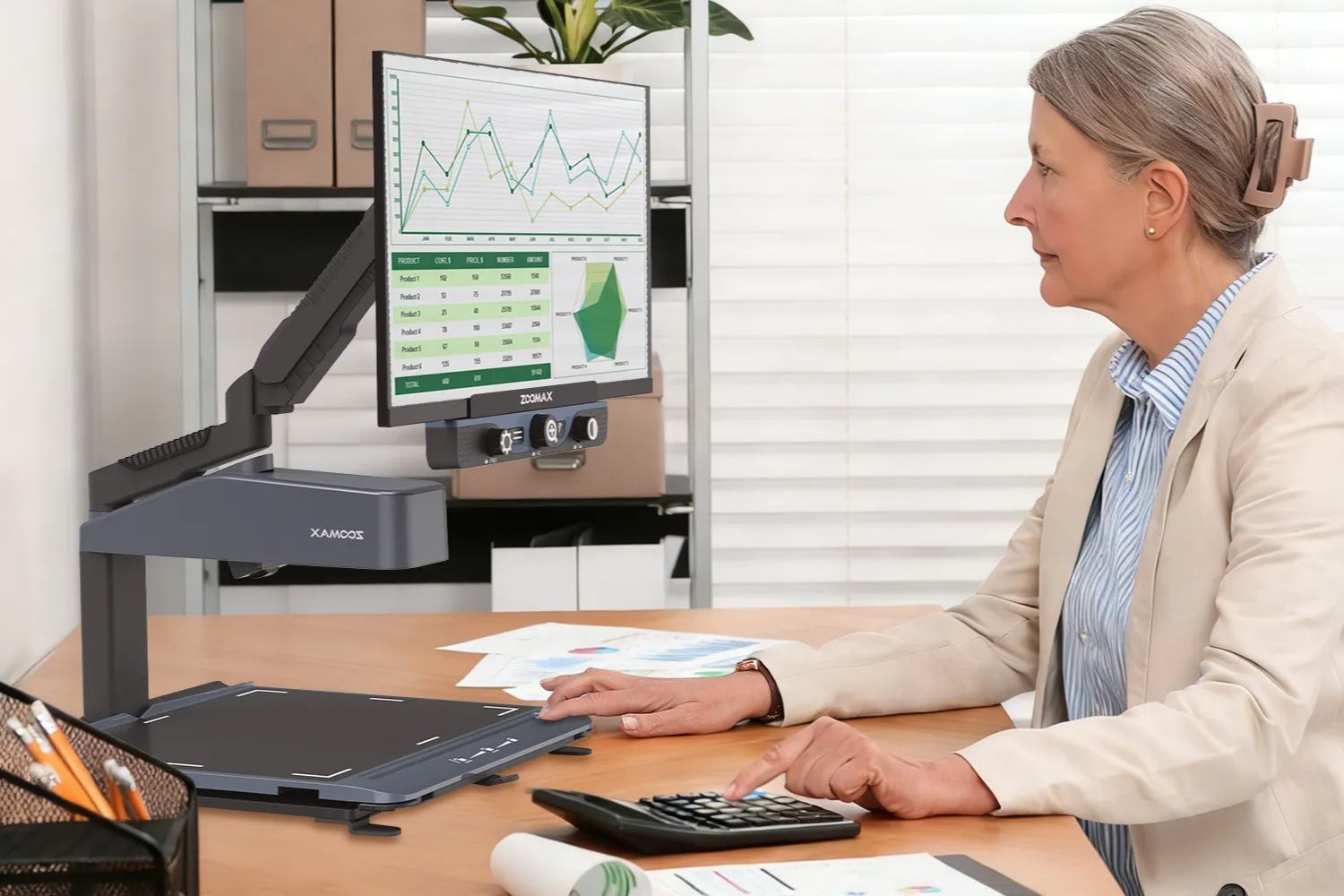 TOPAZ OCR combină funcțiile de mărire video cu tehnologia OCR text-to-speech într-un singur dispozitiv de mărire pentru birou.